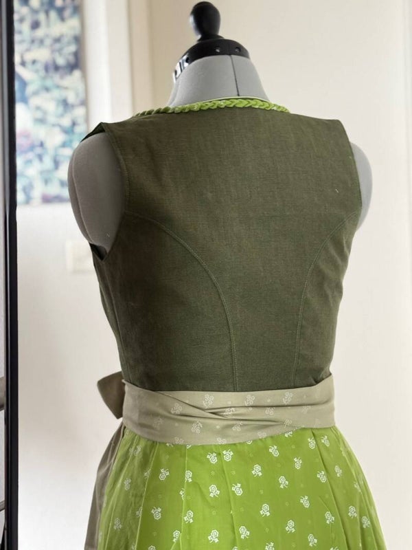 Upcycling eines älteren Baumwolldirndl, Oberteil ist ganz neu in Leinengemisch, neue Schürze in Baumwollsatin